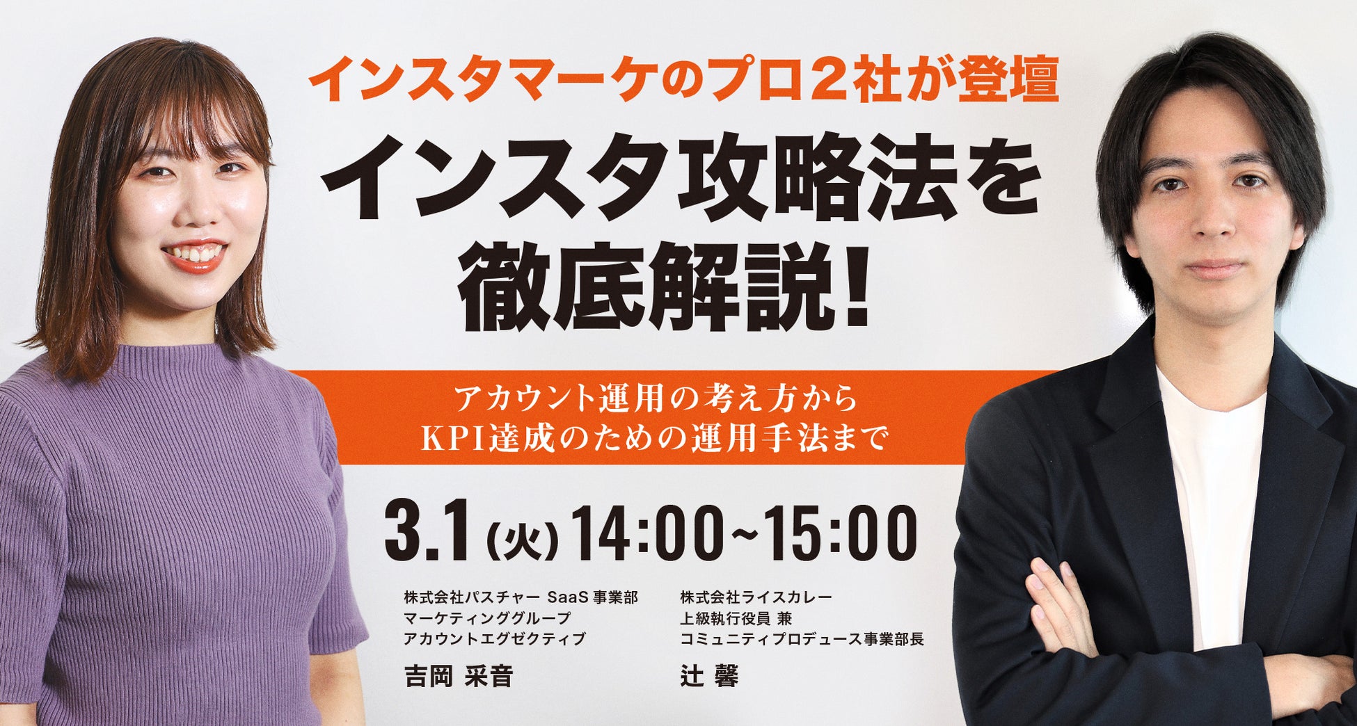 Instagramを中心にSNSマーケティング支援を行う株式会社パスチャー(本社:東京都渋谷区、代表取締役:甲斐 優理子、以下当社)は、SNSを起点にコミュニティコマース支援サービスを提供する株式会社ライスカレー(本社:東京都渋谷区、代表取締役:大久保 遼)と共同で、3月1日(火)14時〜15時に、企業のInstagram担当者向けのセミナー「インスタマーケのプロ2社が登壇!アカウント運用の考え方からKPI達成のための運用手法まで、インスタ攻略法を解説!」を開催いたします。